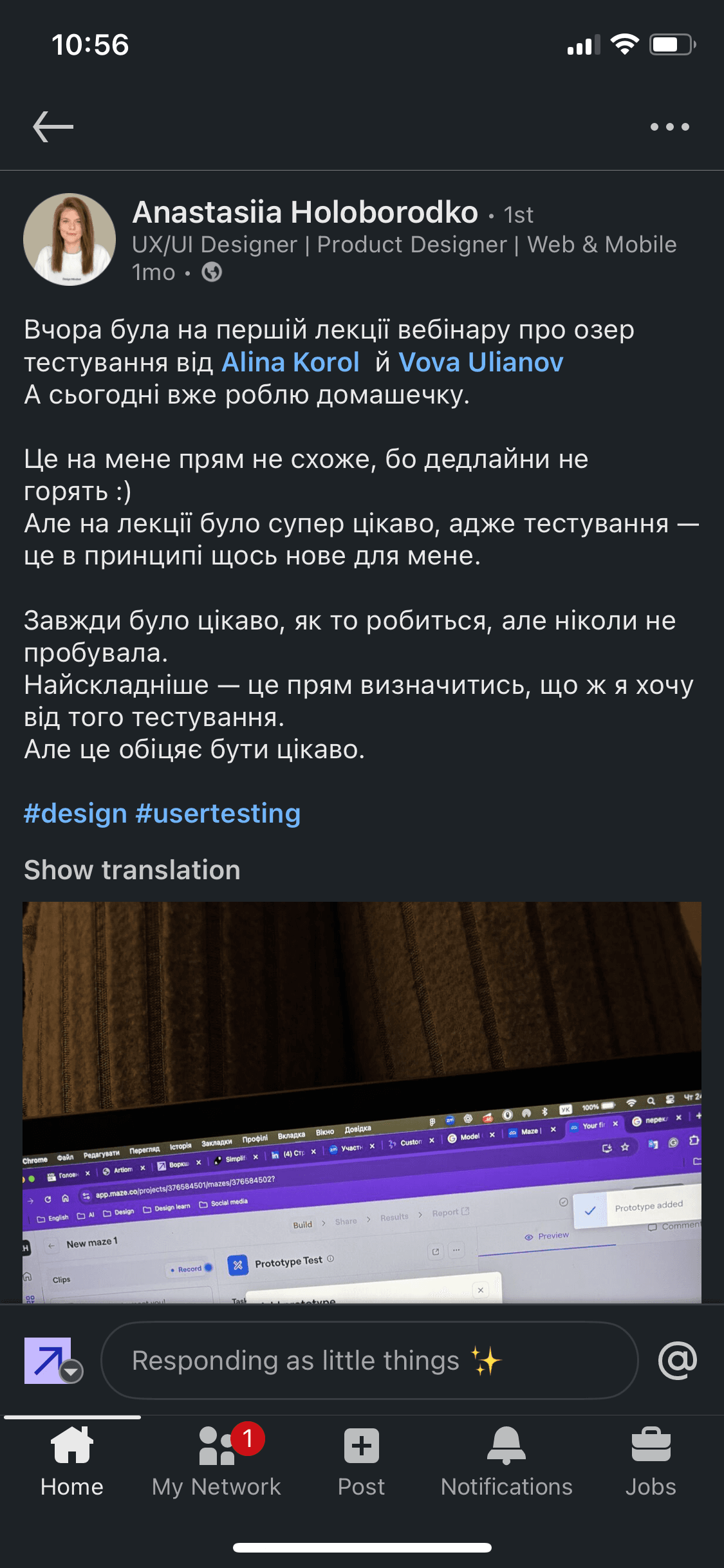 Я дивилася все в записі, але все одно для себе отримала те, за чим прийшла, мені дуже сподобалось, що є купа додаткового матеріалу, а не тільки 2 зустрічі, подобається також що є запис, також була відчутна дружня атмосфера, хотілось би ще прийти на подібні воркшопи, було цікаво, я вперше працювала з мейз, до цього проводила модеровані тести, а немодероварі також виявилися дуже цікавими)