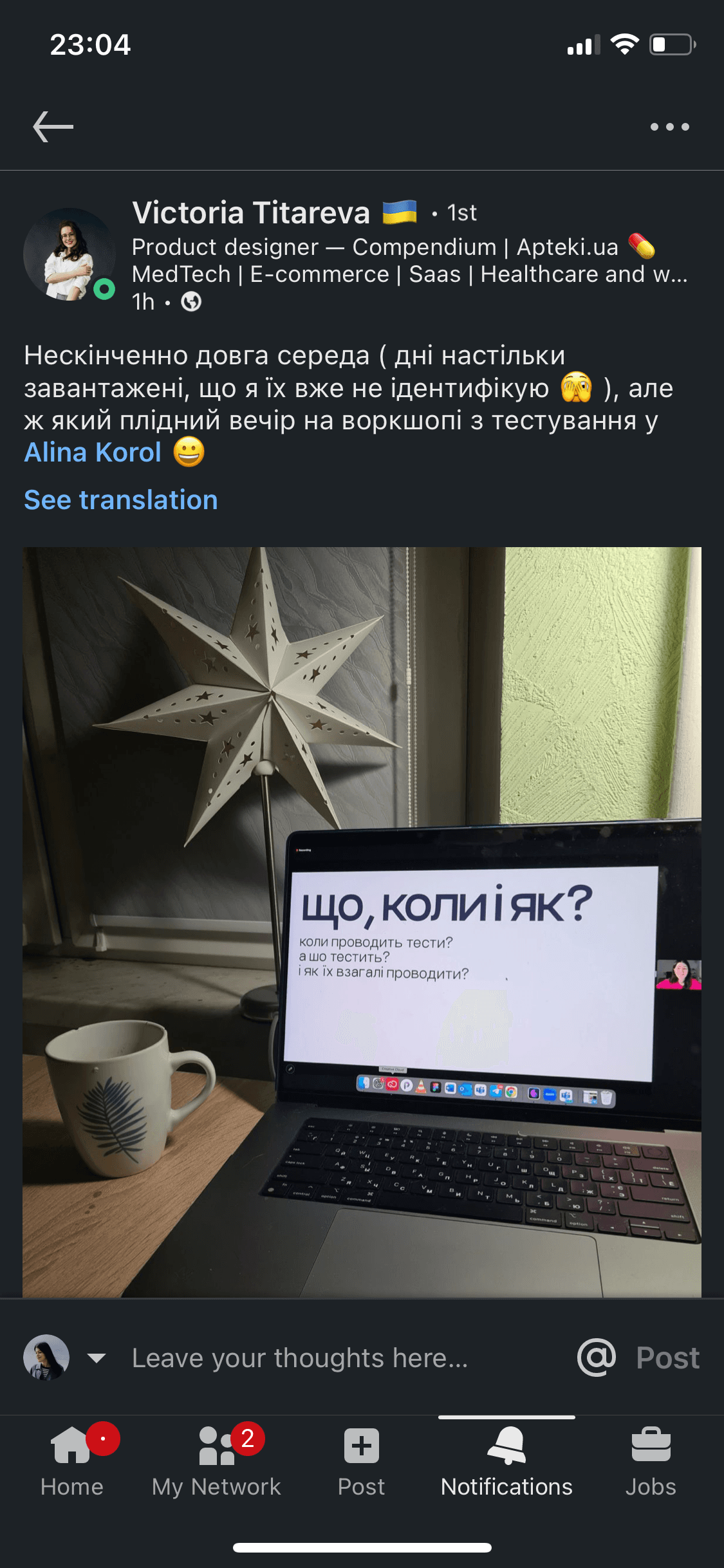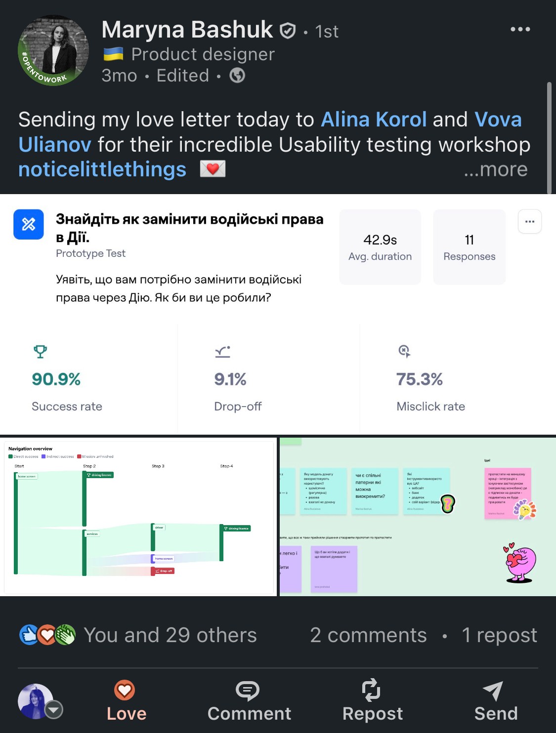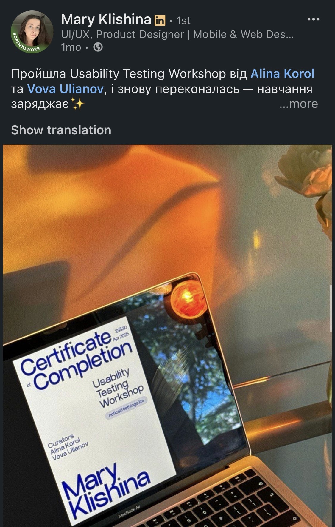 Дуже вдячна за воркшоп! Після цих двох днів я більш впевнена у створенні юзабіліті тестів, розумію що саме питати у респондентів і як аналізувати результати. Я також дякую за велику кількість інсайтів та лайфхаків із реального досвіду, якими ви поділилися. Це безцінна інформація, яка врятує N-кількість робочих годин і дозволить запобігти великій кількості помилок! ❤️ Я з великим задоволенням провела разом із вами цей час та чекаю на наступні воркшопи!)
