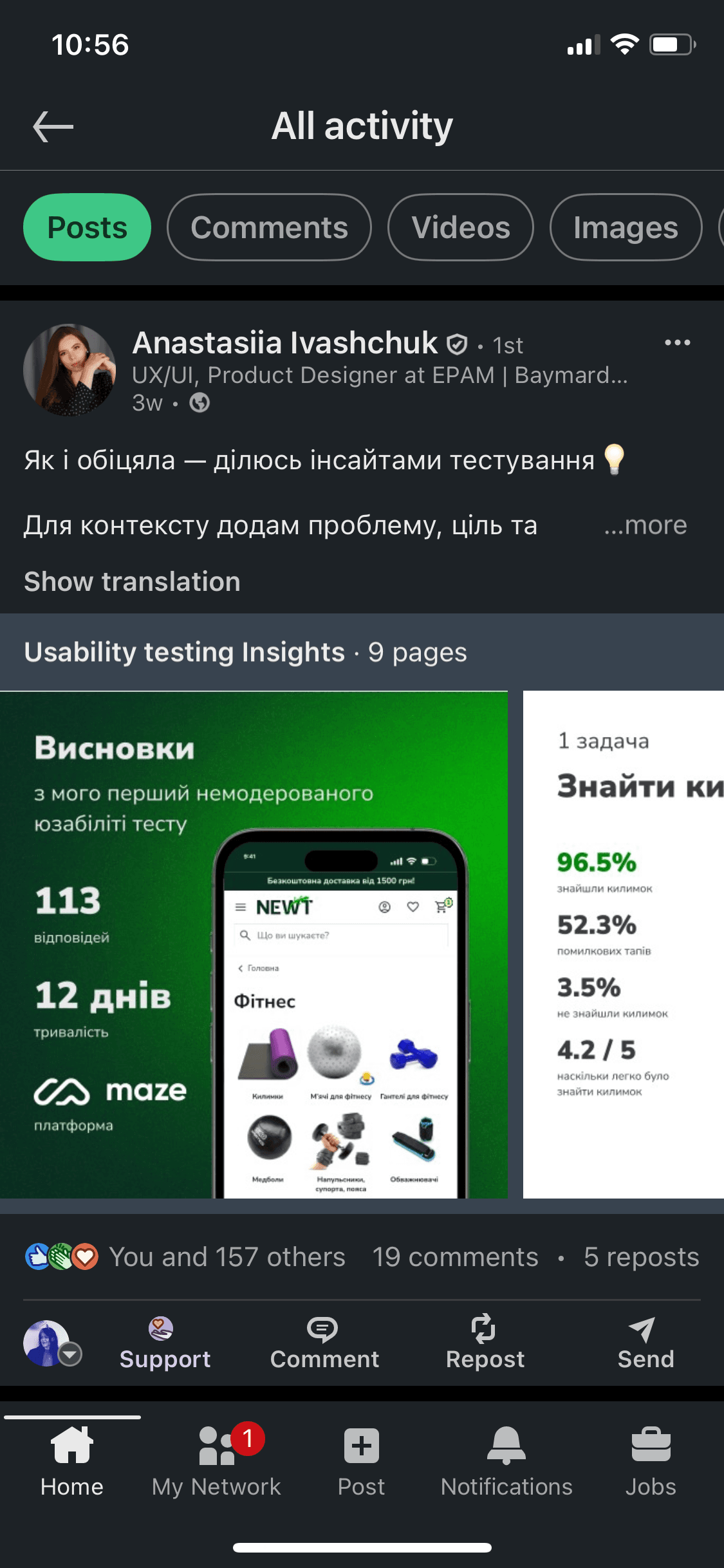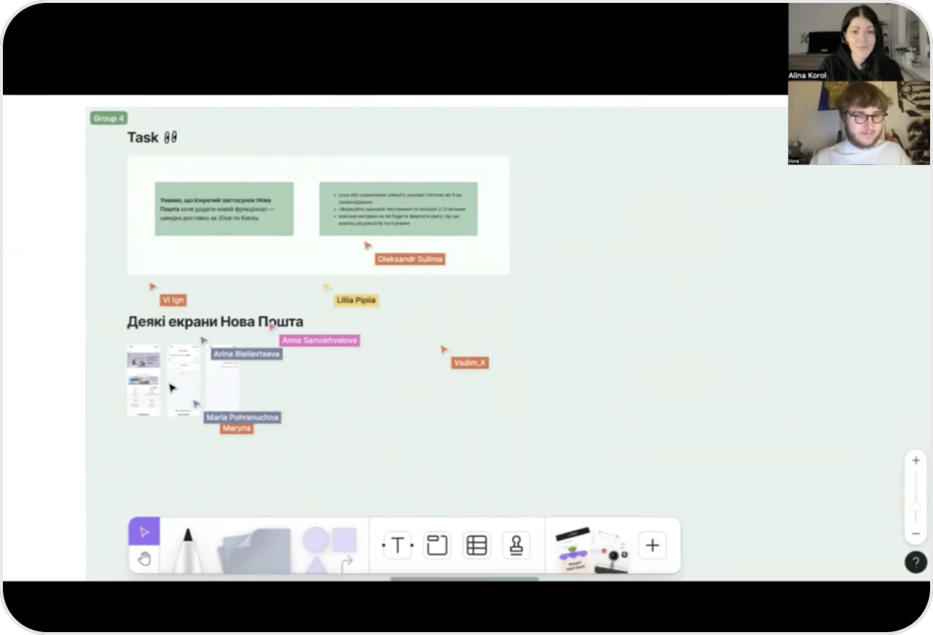 Мені дуже сподобалась практична частина, адже в мене нема досвіду саме тестування. Можливо з практикою я впоралась не дуже, але для мене це дало багато інсайтів і розумінь, куди треба рухатись і на що взагалі треба звертати увагу у подальшому. Для мене було цінним саме спробувати ці тести в команді (формування гіпотез виявилось для мене досить складним), а особливо, подивитись на те, як інші команди це робили і з цього також підгледіти для себе корисні штуки :)